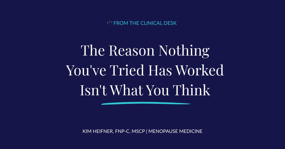 I'm Kim Heifner, FNP-C, MSCP - a menopause-certified nurse practitioner with 30 years of clinical experience and founder of a menopause telehealth practice. I built this practice because I kept seeing the same thing: brilliant, capable women being dismissed, undertreated, and sent home without real answers.
